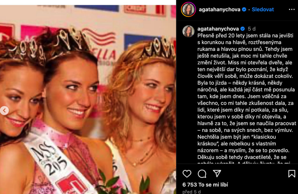 „Přesně před 20 lety jsem stála na jevišti s korunkou na hlavě, roztřesenýma rukama a hlavou plnou snů. Tehdy jsem ještě netušila, jak moc mi tahle chvíle změní život,“ napsala s nostalgií. Zkušenost z miss jí dala sebevědomí i motivaci. „Nechtěla jsem být jen klasickou kráskou, ale rebelkou s vlastním názorem – a myslím, že se to povedlo,“ dodává.