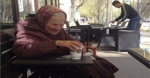 Jednoho dne do kavárny přišla starší žena, posadila se ke stolu, vytáhla si suchý kus chleba a začala jíst rovnou před ním.