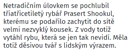 Kdo říkal, že chytání ryb je nuda? Rybář z Thajska si jednoho dne zašel na ryby, ale dlouho dobu mu žádná nebrala. Pak se ale stal „zázrak“ a konečně se mu podařilo jednu rybu chytit. Když viděl, jak jeho úlovek vypadá, zůstal v obrovském šoku! Rybáři se podařilo ulovit zvláštní rybu, která má obličej jako člověk. Podívejte se na další straně.