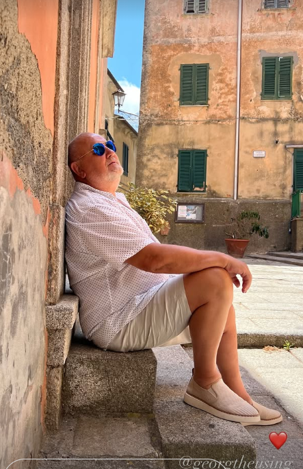 Na fotce je Georg zachycen v naprostém klidu, jak sedí opřený o starou kamennou zeď, hlavu zakloněnou směrem k paprskům odpoledního slunce. Letní outfit doplněný stylovými espadrilkami a modrými brýlemi jen podtrhuje nenucenou eleganci a pohodu, kterou okamžik vyzařuje.