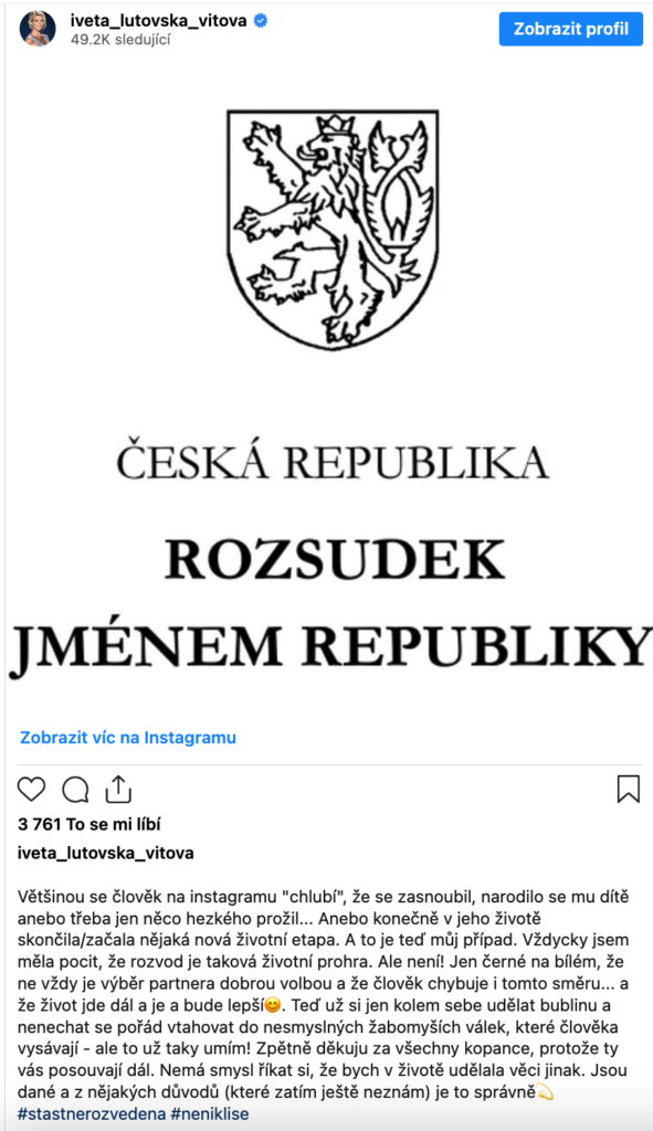 V úterý však přišel okamžik, který Iveta dlouho očekávala – oficiálně se stala rozvedenou ženou. O tomto důležitém životním milníku se okamžitě podělila na Instagramu: „Vždycky jsem měla pocit, že rozvod je taková životní prohra. Ale není! Lidé se často na sociálních sítích chlubí něčím pozitivním, ale v mém životě právě skončila jedna etapa.“