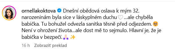 Podle vyjádření samotné Ornelly došlo k náhlému zdravotnímu problému krátce před začátkem oslavy. „Babička chyběla. Bohužel ji těsně před odjezdem odvezla záchranka. Není v ohrožení života, ale dost mě to zasáhlo. Hlavní je, že je v bezpečí,“ napsala na sociálních sítích. Navzdory této nepříjemné situaci se snažila udržet pozitivní náladu a oslava nakonec proběhla v duchu rodinné soudržnosti.