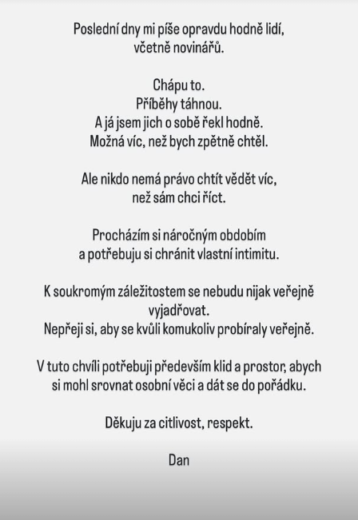 Po týdnech dohadů se Daniel Krejčík rozhodl alespoň částečně reagovat. Jak uvedl server iDNES.cz, herec se vyjádřil na Instagramu slovy: „Tak hezký víkend s MDŽ! Náročné období, musím si chránit intimitu.“ Touto krátkou větou sice neodpověděl na všechny otázky, ale zároveň potvrdil, že jeho soukromí nyní rozhodně neprochází klidnou etapou.