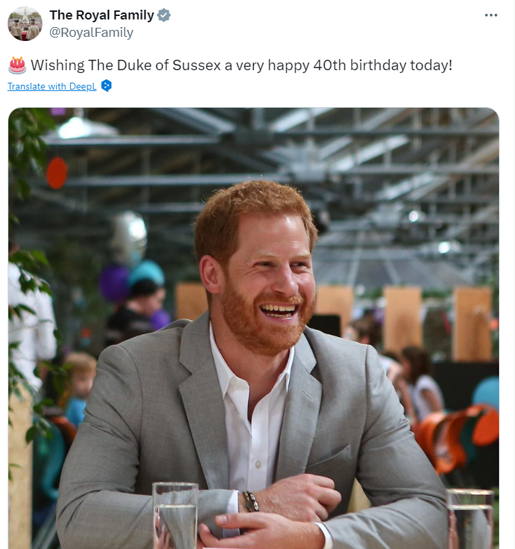 Když 15. září princ Harry oslavil své kulaté narozeniny, královská rodina neváhala a popřála mu na svých oficiálních účtech na sociálních sítích. Pozornost však upoutala zveřejněná fotografie, na které byla jeho manželka Meghan Markle výrazně nepřítomná. Fotografie, kterou sdíleli jak král Karel III., tak princ William s manželkou Kate Middleton, pocházela z roku 2018, kdy Harry ještě plně zastával své královské povinnosti. Na původním snímku pořízeném během návštěvy v Dublinu s Harrym seděla jeho žena Meghan, ale na zveřejněné verzi chyběla.