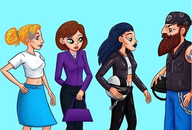 Také plachá zelenooká dívka ve fialové bundě nebo blondýnka v modré sukni může být manželkou motorkáře. Správně odpověděla na tuto hádanku pouze 2 % lidí. Už víte, která z nich je motorkářova manželka?