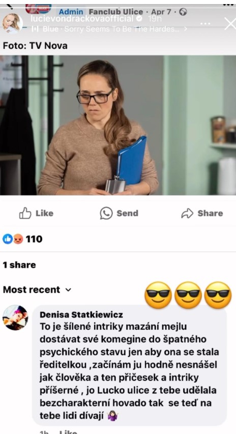 Nedávno Vondráčková sdílela na svém instagramu další nenávistný komentář od divačky seriálu Ulice.