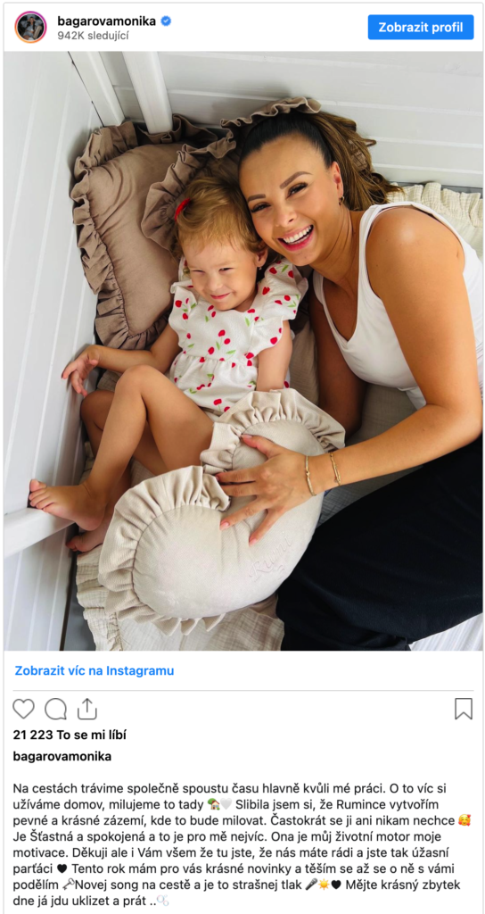 „Slibila jsem si, že Rumince vytvořím pevné a krásné zázemí, kde to bude milovat. Častokrát se ji ani nikam nechce.Je Šťastná a spokojená a to je pro mě nejvíc. Ona je můj životní motor moje motivace,“ sdílela zpěváčka.