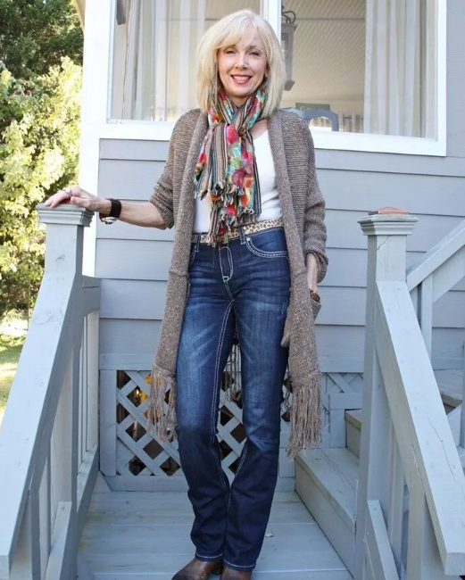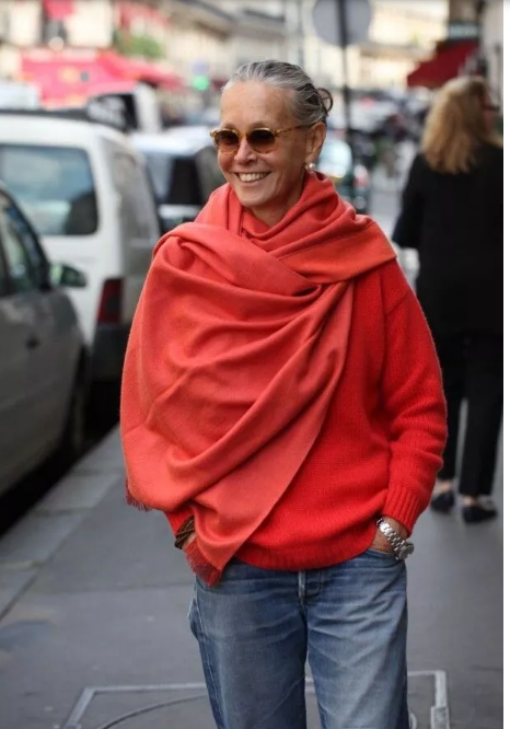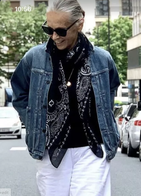 2️⃣ Džínová bunda a lehký šátek: Mladistvý look