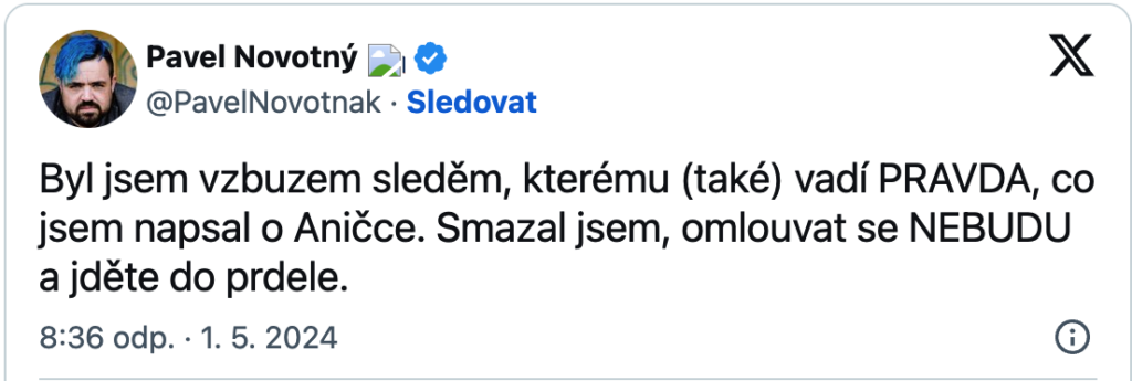Jakmile Anička skutečně odešla, bolest veřejnosti se proměnila v hněv – a Pavel Novotný je opět v hledáčku mnoha lidí. Na sociálních sítích mu lidé připomínají jeho krutá slova a neodpustitelné prorokování. „Nikdy mu to neodpustím,“ zní z komentářů. „Tohle se neříká ani v největším zoufalství,“ přidávají další.