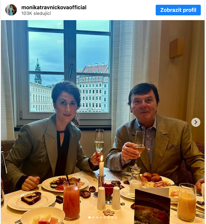 „Oslavy máme pracovní v Drážďanech …I u snídaně SLAVÍME! Happy Birthday ❤️🥂 18 let společně SLAVÍME narozeniny. Vše nejlepší a hlavně zdraví, můj milý! 🍀🙏 Pavel Trávníček 73let,“ napsala Monika Trávníčková na Instagramu.