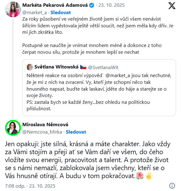 K jejím slovům se připojila i senátorka Miroslava Němcová z ODS. Ocenila odvahu Pekarové postavit se otevřeně nenávisti a popřála jí sílu do dalších životních i profesních kroků.