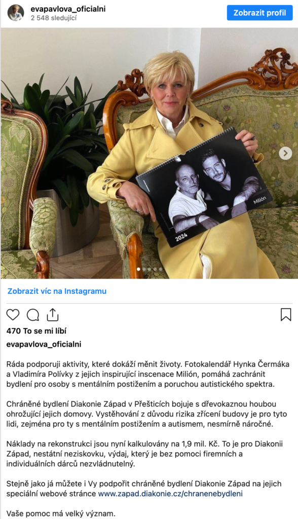 „Ráda podporuji aktivity, které dokáží měnit životy. Fotokalendář Hynka Čermáka a Vladimíra Polívky z jejich inspirující inscenace Milión pomáhá zachránit bydlení pro osoby s mentálním postižením a poruchou autistického spektra“, prozradila prezidentova manželka.
