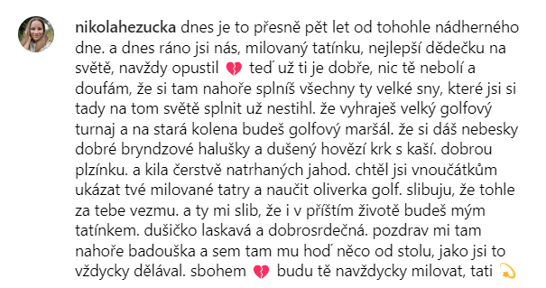 Nikola ve svém příspěvku dále vzpomíná na krásné momenty a sny, které její otec nestihl naplnit: „Teď už ti je dobře, nic tě nebolí a doufám, že si tam nahoře splníš všechny ty velké sny, které jsi si tady na tom světě splnit už nestihl. Vyhraješ velký golfový turnaj a na stará kolena budeš golfový maršál,“ psala Nikola. Její slova jsou plná lásky a naděje, že její otec nyní nalezne klid a štěstí na druhé straně.