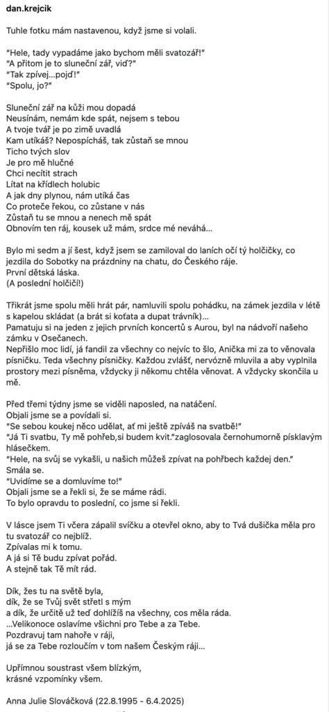 Daniel Krejčík se rozhodl sdílet své pocity veřejně, jako vzpomínku i poctu. Anička v jeho životě zanechala stopu, která se nedá smazat. „Děkuju ti za všechno. Za tvůj hlas, tvůj smích, tvou energii, která tu s námi zůstane,“ napsal dojemně.