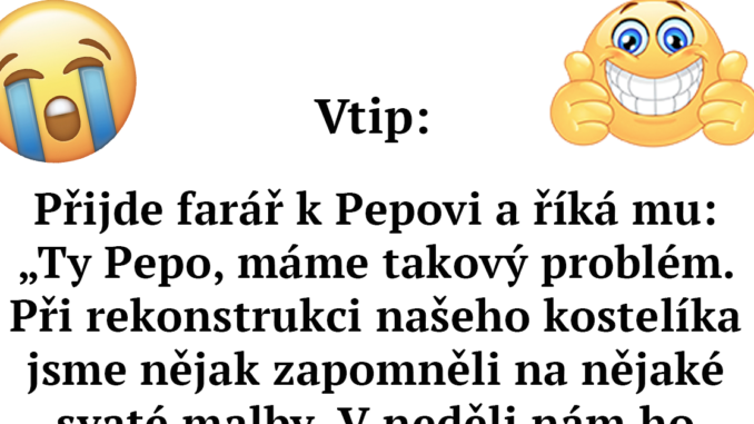 TOP vtip dnešního dne: Pepa dostal za úkol vymalovat kostel Publikováno 14. 4. 2024 Autor: David Nossek foto: facebook.com Pokračování vtipu si otevřete níže. Další články Pekarová Adamová se neudržela: Okamurovi poslala tvrdý vzkaz kvůli luxusnímu letu na Slovensko. Mluví o pokrytectví i o tom, co sama dokázala ušetřit Topolánek otevřeně o boji s agresivní rakovinou: Lékaři mu řekli, kolik času může mít. Bývalý premiér odmítá čekat na konec Narozeninová bohyně: Dara Rolins slaví 53 let a dokazuje, že stále vládne scéně. Rok plný tlaků ji nezlomil, ale posílil Ranní show v tichu: Leoš Mareš nedorazil a rádio oznámilo termín rozloučení s Patrikem Hezuckým. Emoce v éteru byly silnější než slova Agáta Hanychová v slzách: Malou Rozárku museli uspat! Lékaři objevili genetickou predispozici a influencerka prožila jeden z nejhorších dnů života Pavel varuje před temnou budoucností Evropy: Hrozí opakování Mnichova? Západ prý ztrácí odvahu