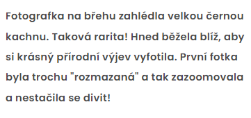 Fotografka na břehu zahlédla velkou černou kachnu. Taková rarita! Hned běžela blíž, aby si krásný přírodní výjev vyfotila. První fotka byla trochu „rozmazaná“ a tak zazoomovala a nestačila se divit! Podívejte se do naší galerie na to, co ve skutečnosti vyfotila.